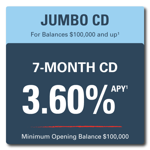 1APY = Annual Percentage Yield as of 12/15/2025 and subject to change until CD is opened. $1,000 minimum balance required to open Standard CD. $100,000 minimum required to open Jumbo CD. Interest is compounded and paid quarterly and at maturity. Once opened, the CD rate will not change until maturity. Fees may reduce earnings. Penalty for early withdrawal.